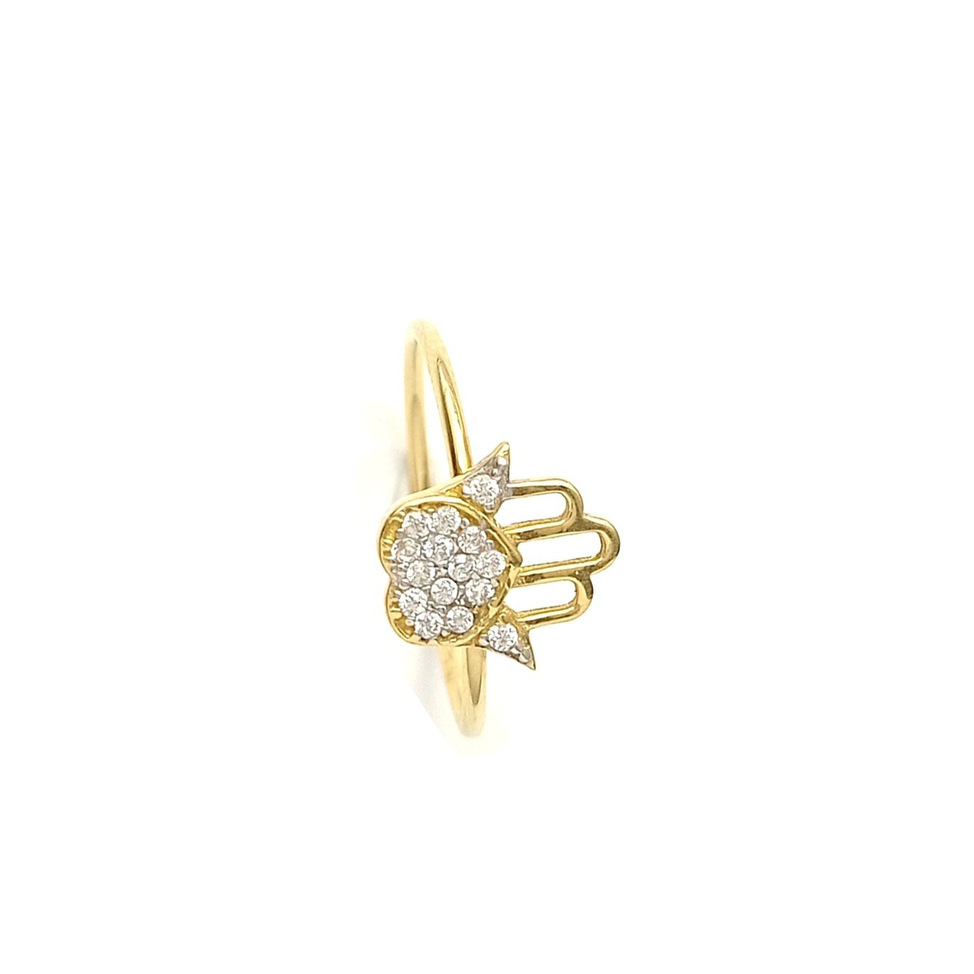 Anillo oro 18k con circones mano hamsa, su peso es 1.8g y su ancho de 1.15 mm es fabricado en todas las tallas