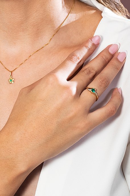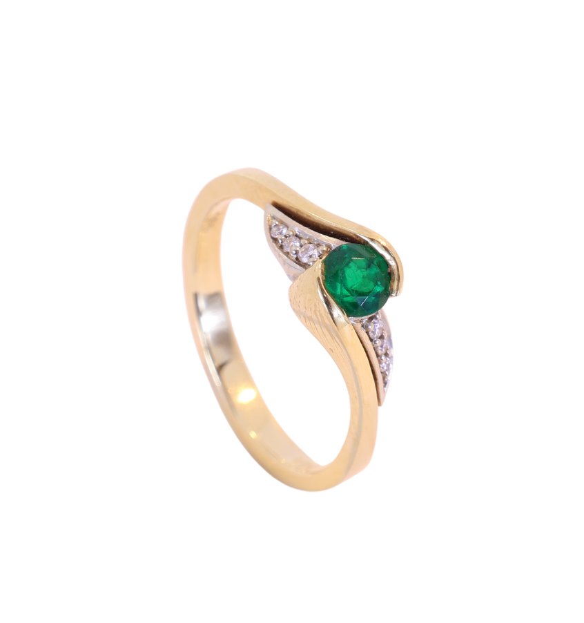ANILLO DOS OROS 18K ESMERALDA DE 4.25mm CON 0.63ct Y SEIS DIAMANTES DE 1.75mm CON 0.12ct, PESA 3.3 GRAMOS.