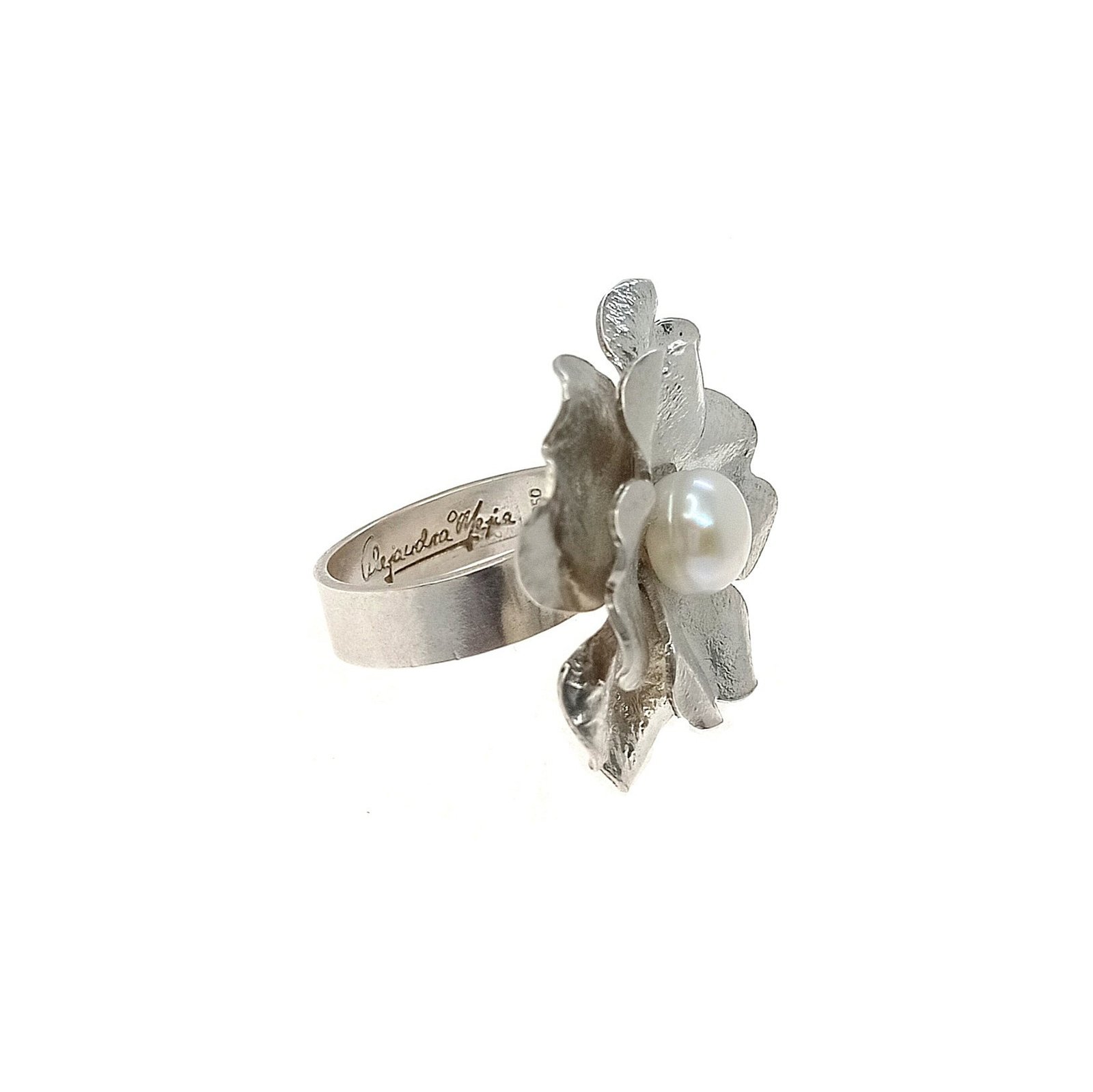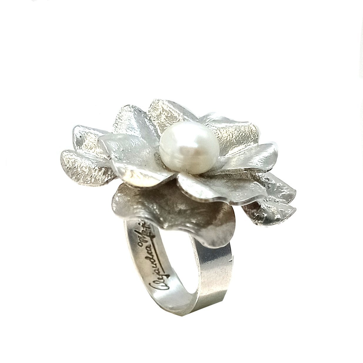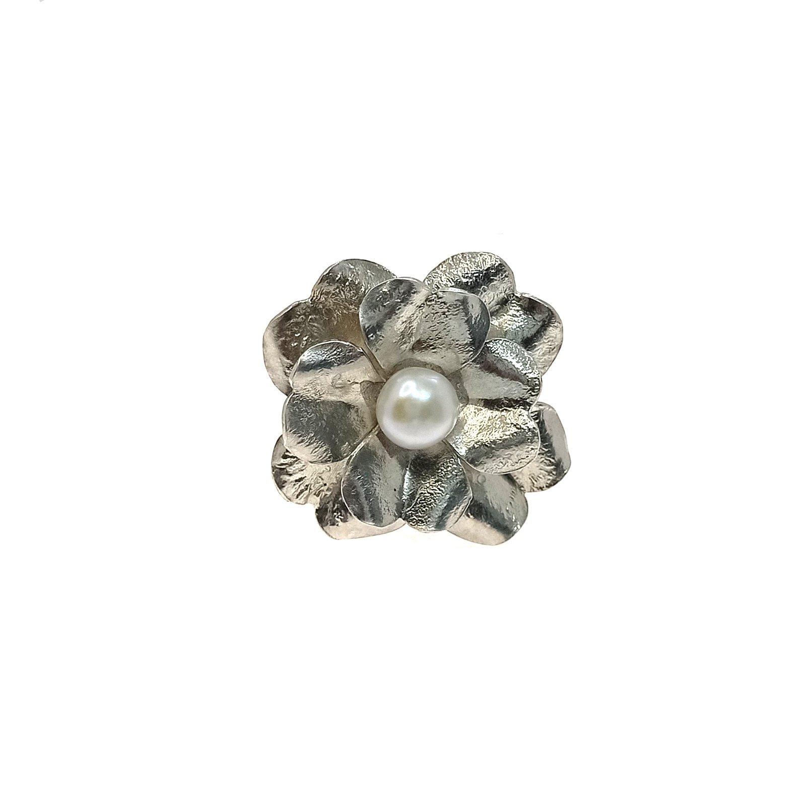 Anillo plata en flor y perla cultivada, ajustable para todas las tallas