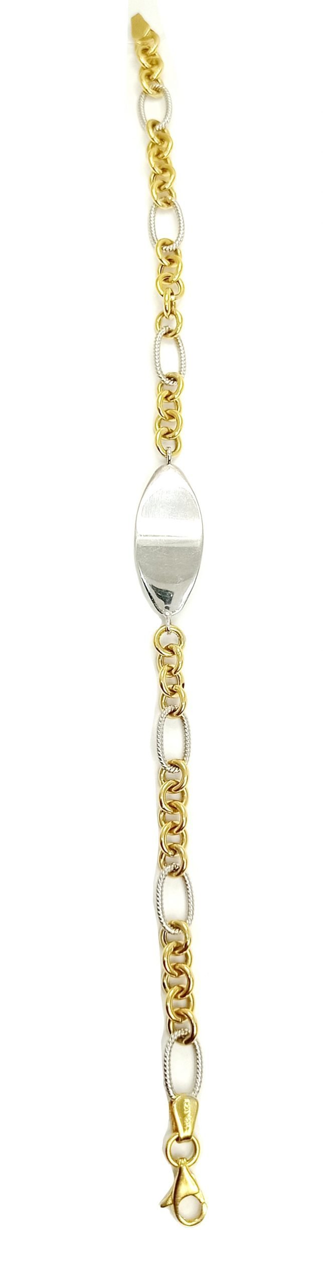 Pulsera en dos oros 18k su peso 5.9 g y mide 19 cm de largo, la placa mide 1 cm de ancho por 2.5 cm de largo